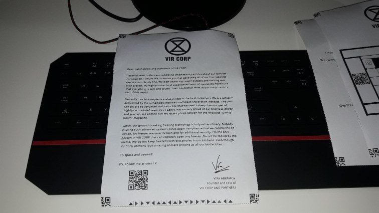 VIR Corp is a portable AR escape room game. Players are tasked to find a cure sample from an abandoned bioweapon lab in the form of a letter and three hidden puzzle pages.